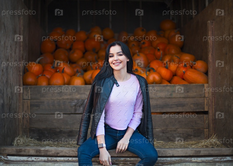 Модная красивая молодая девушка на осеннем тыквенном фоне. Веселимся и позируем