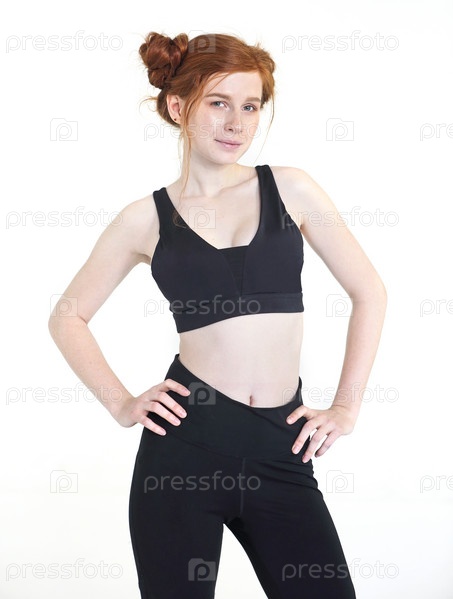 Сильная спортивная женщина-бегунья на белом фоне в обтягивающем спортивном костюме