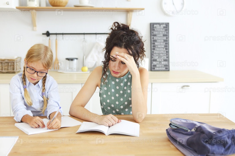 Мама помогает дочери с уроками на кухне