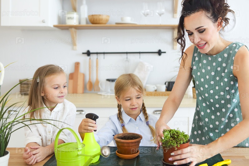 Красивые молодые женщины с двумя маленькими милыми дочерьми сажают цветок