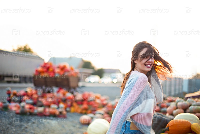 Модная красивая молодая девушка на осеннем тыквенном фоне. Веселимся и позируем