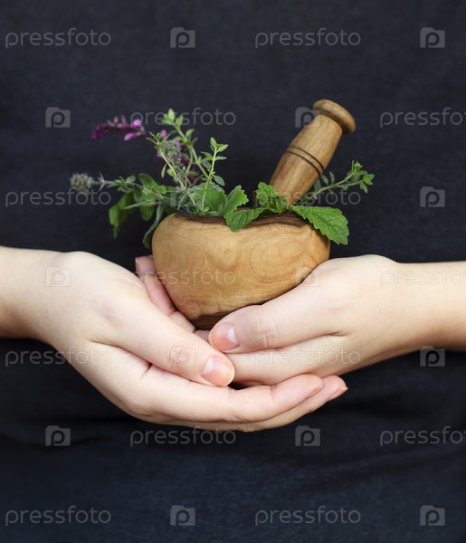 Женщина-урожай показывает раствор с пестиком и травами