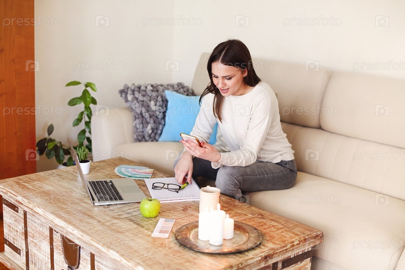 Женщина-фрилансер с помощью смартфона дома