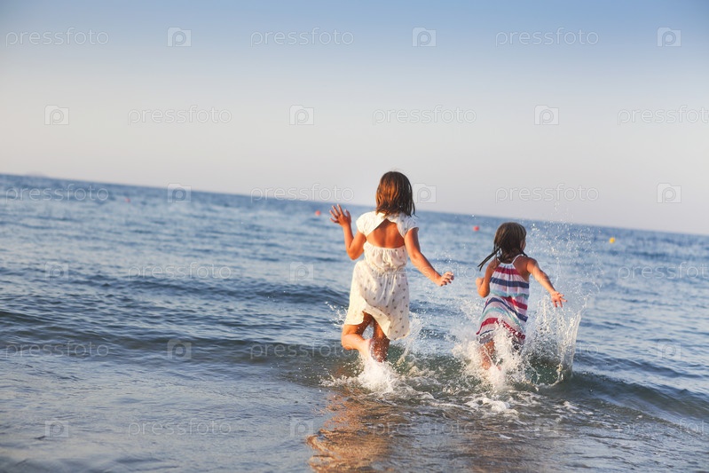 Счастливые дети бегают по морской воде