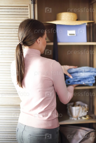 Весенняя уборка шкафа. Молодая женщина у хранилища в стиле ретро