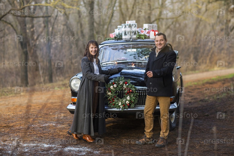 Счастливая семья с бенгальскими огнями в лесу