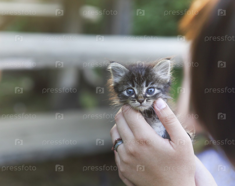 Маленькая девочка держит котенка на размытом фоне на открытом воздухе