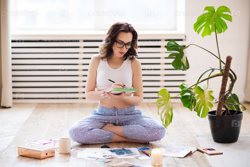 Молодая брюнетка создает свою карту желаний фэн-шуй
