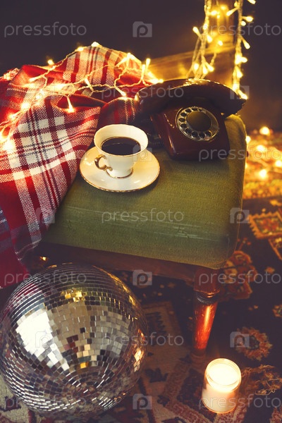 Натюрморт в канун Нового года или Рождества с ретро-телефоном, диско-шаром, кофе, свечой и одеялом