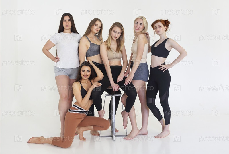 Счастливые женщины разных рас в спортивном топе и леггинсах