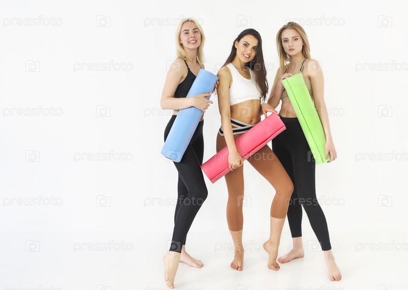 Группа спортивных счастливых женщин, держащих коврики для йоги, стоящие в помещении