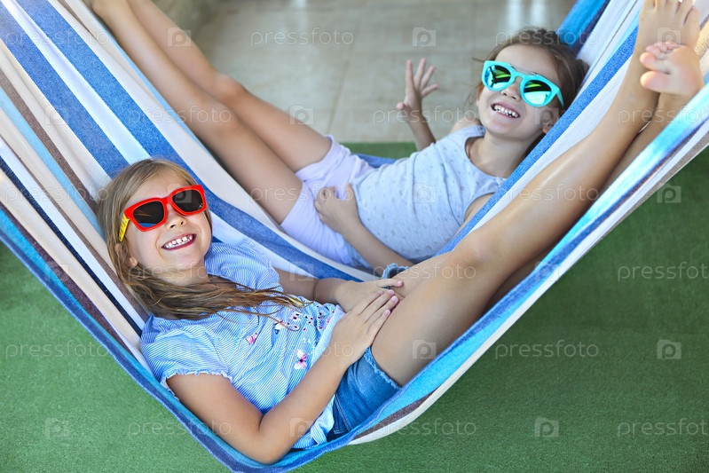 Маленькие счастливые девочки играют в гамаке в летний день