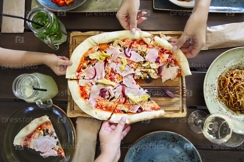 Концепция приготовления дружеского семейного ужина. Горизонтальный, ужин с пиццей, пастой, белым вином и лимонадом