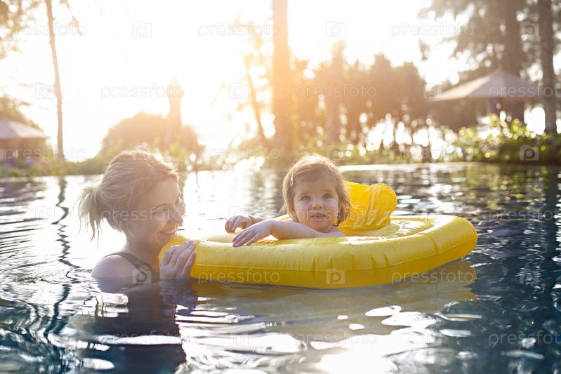 Милая маленькая девочка учится плавать с мамой в бассейне