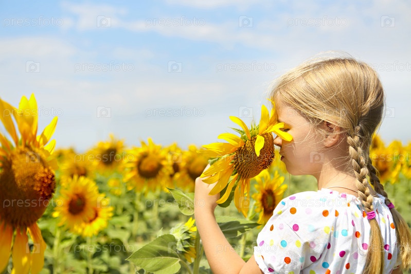 Ребенок играет в поле подсолнухов