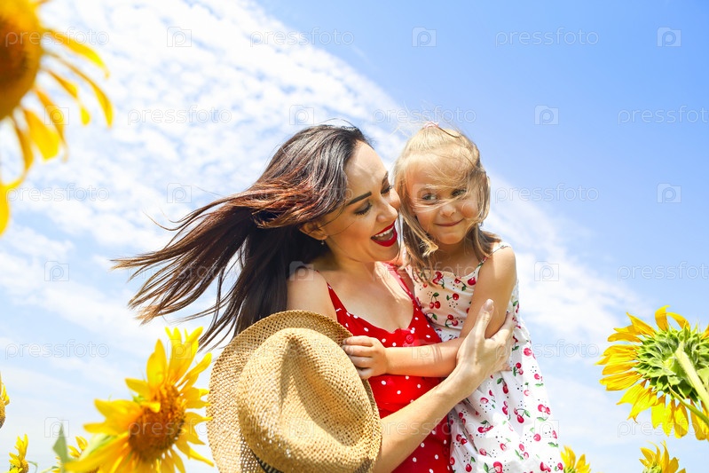 Мать и ее маленькая дочь в поле подсолнечника