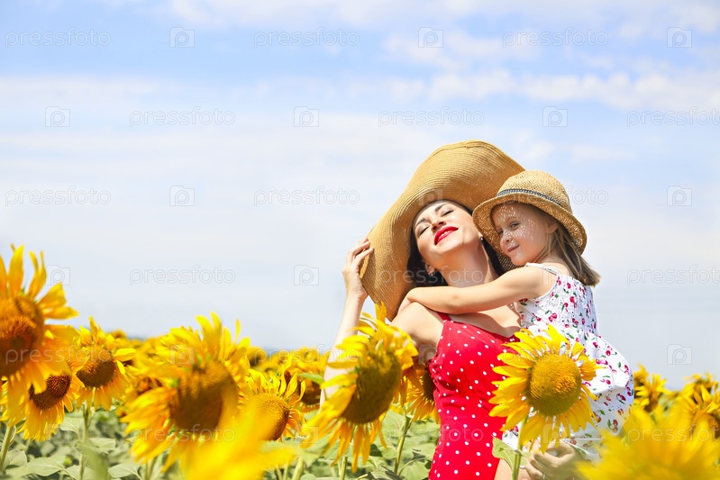 Мать и ее маленькая дочь в поле подсолнечника