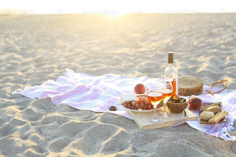 Пикник на свежем воздухе с розовым вином, фруктами, мясом и сыром