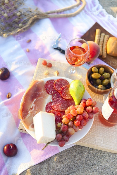 Пикник на свежем воздухе с розовым вином, фруктами, мясом и сыром