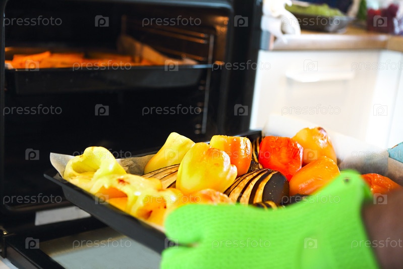 Крупный план жареного перца и баклажанов в лотке. Мужчина держит его в руках в перчатках для духовки