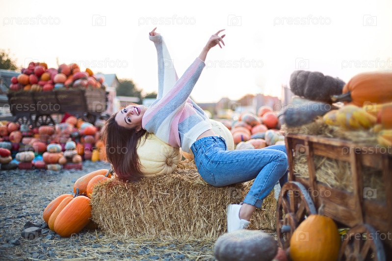 Модная красивая молодая девушка на осеннем тыквенном фоне. Веселимся и позируем