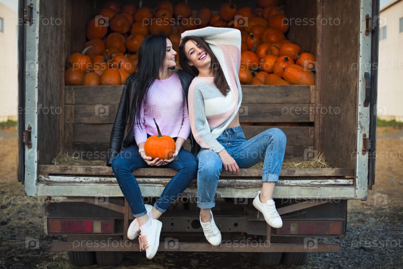 Модные красивые молодые подруги вместе на осеннем тыквенном фоне. Веселимся и позируем