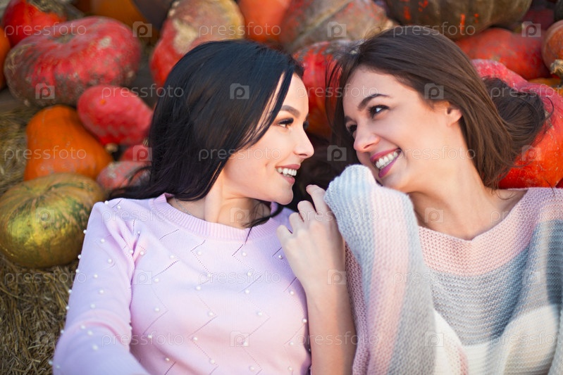 Модные красивые молодые подруги вместе на осеннем тыквенном фоне. Веселимся и позируем