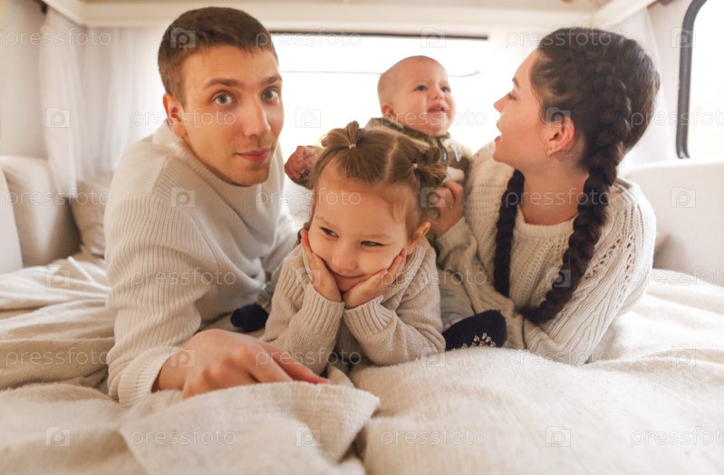Портрет улыбающейся счастливой семьи с детьми в доме на колесах