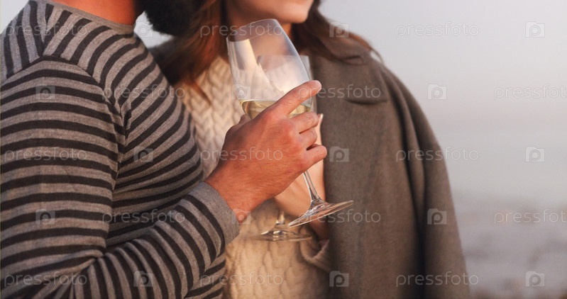 Молодая влюбленная пара на скалистом побережье на закате