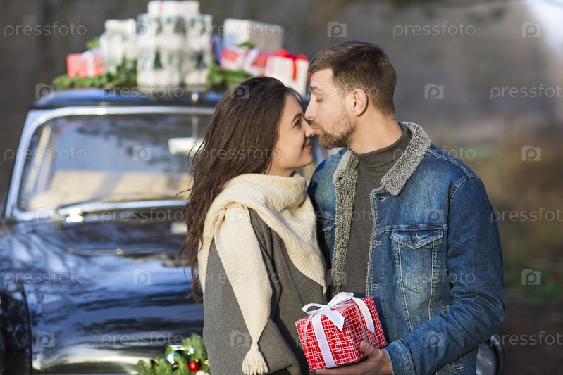 Пара целуется в старинной машине с подарками на крыше