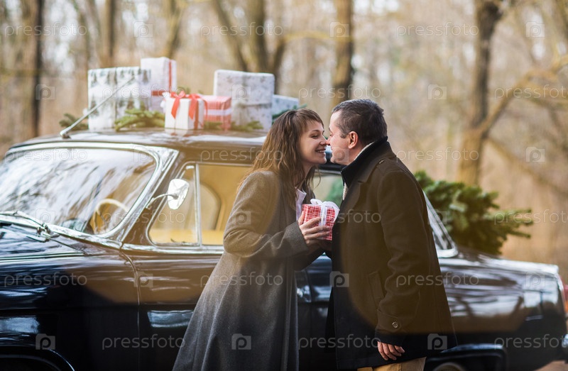 Пара целуется в старинной машине с подарками на крыше