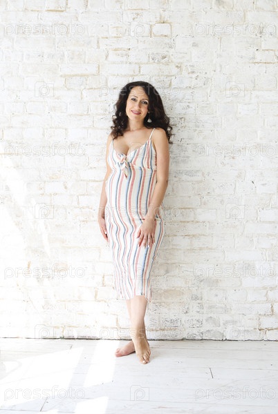 Беременная улыбающаяся женщина трогает живот руками