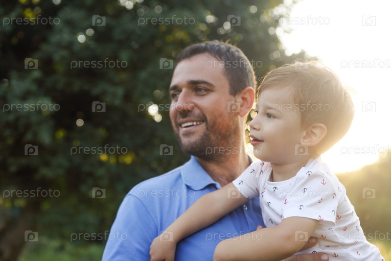 Портрет молодого человека, держащего в руках очаровательного спящего ребенка в саду
