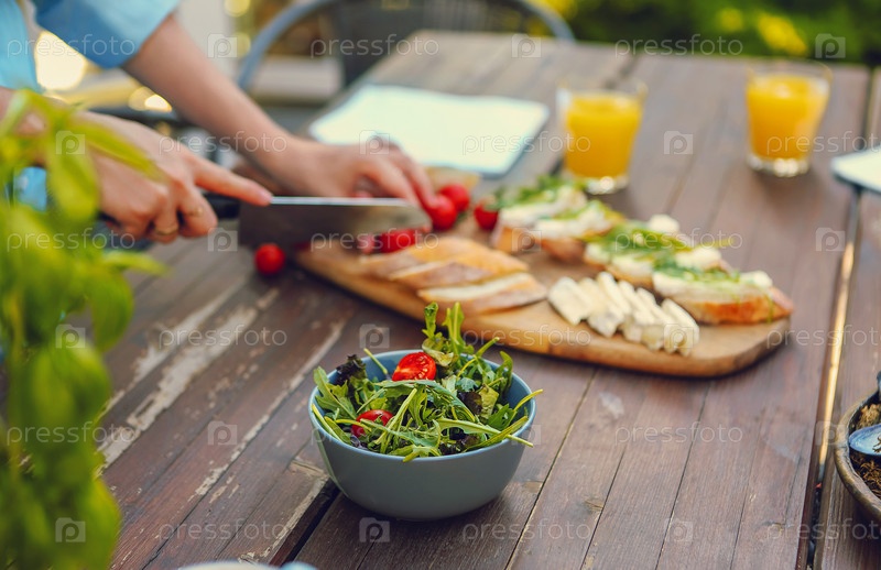 Молодая женщина готовит ужин дома в саду