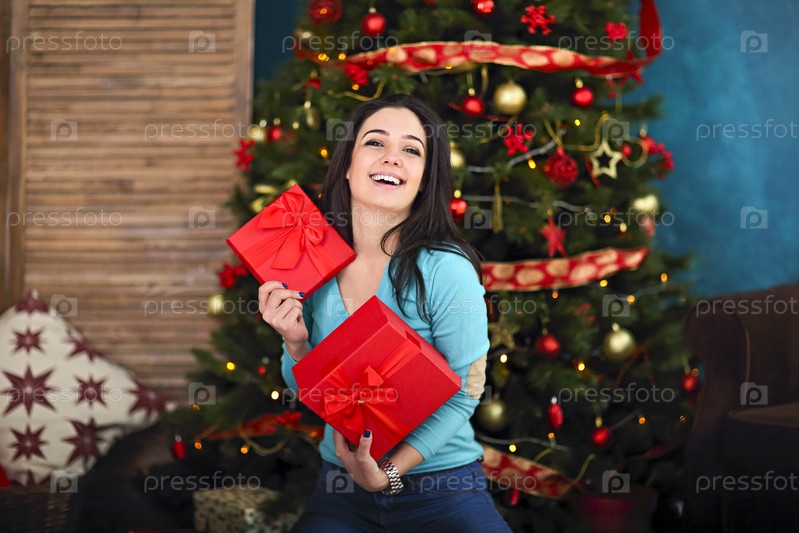 Улыбающаяся счастливая женщина с подарочной коробкой над гостиной на фоне рождественской елки