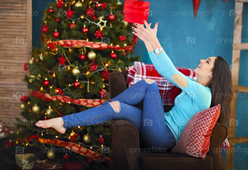 Улыбающаяся счастливая женщина с подарочной коробкой над гостиной на фоне рождественской елки