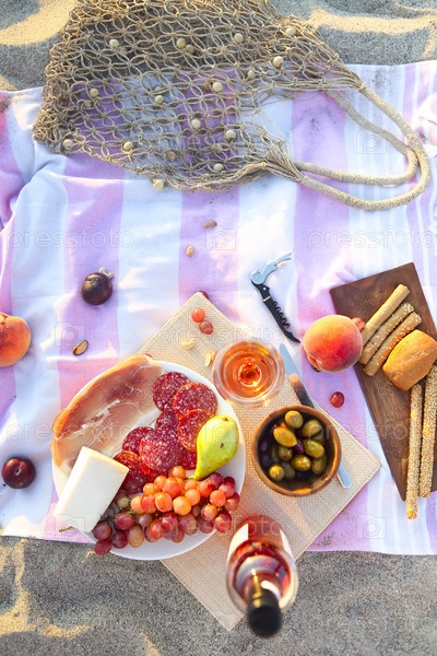 Пикник на свежем воздухе с розовым вином, фруктами, мясом и сыром