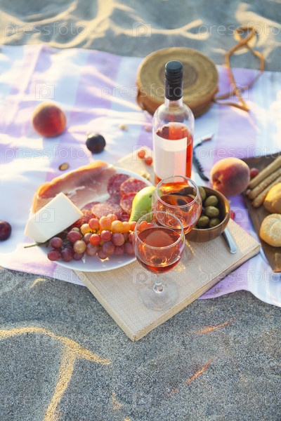 Пикник на свежем воздухе с розовым вином, фруктами, мясом и сыром