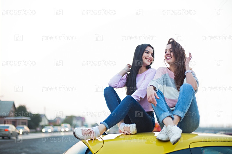 Лучшие подруги приветствуют автомобильную поездку на закате. Счастливые люди на природе в отпуске