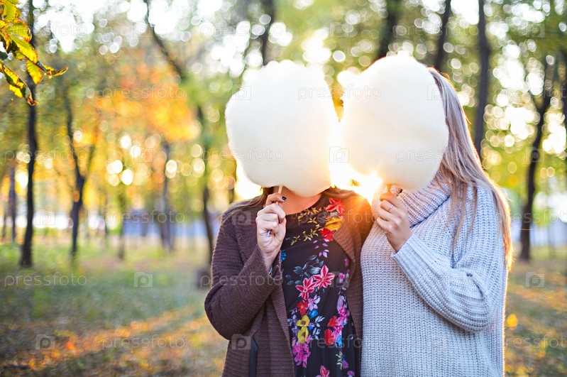 Модные красивые молодые подруги с сахарной ватой вместе на фоне осеннего парка. Веселимся и позируем