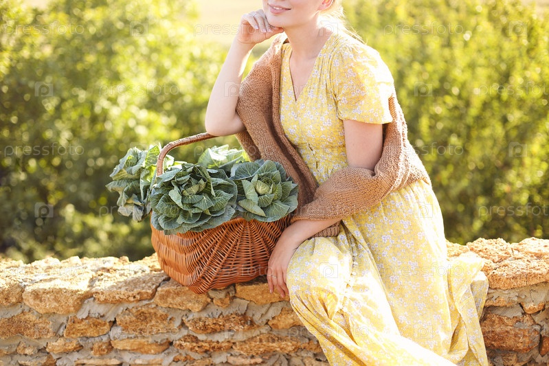 женщина с капустой сидит на кирпичном заборе