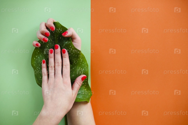 Женщина со свежим листом, показывающая маникюр