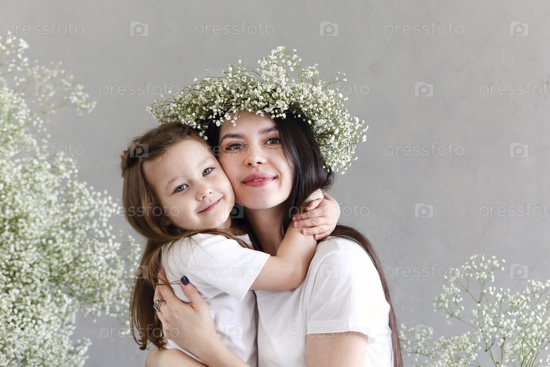 Молодая брюнетка мать и маленькая дочь стоят у стены с большим цветочным венком