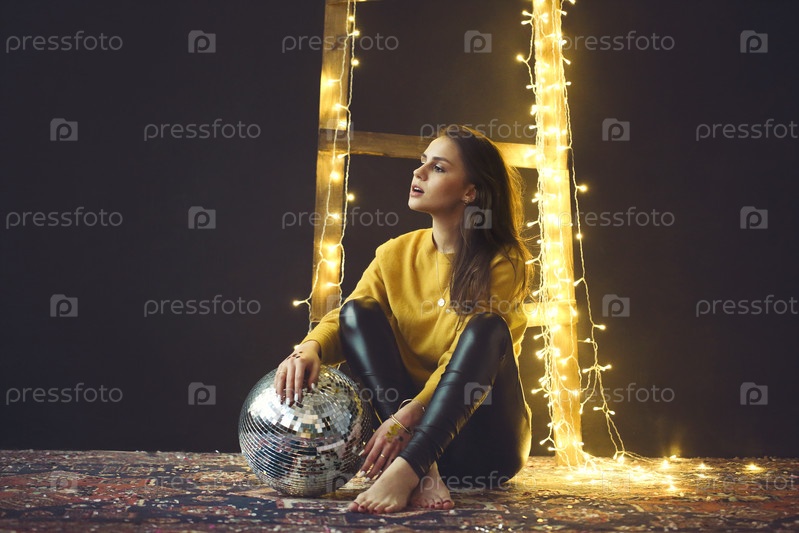 Красивая молодая девушка в желтом свитере держит диско-шар