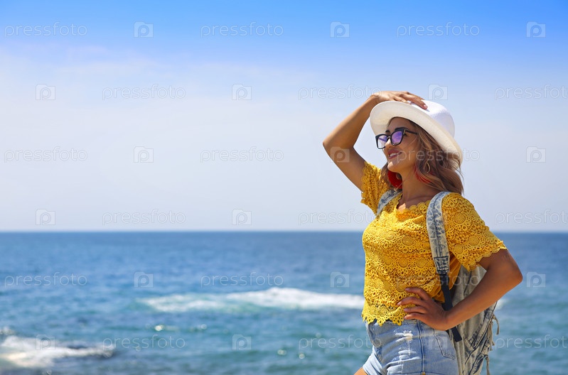 Женщина-туристка с рюкзаком в солнцезащитных очках и соломенной шляпе