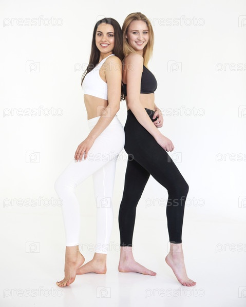Две спортивные девушки блондинка в черном и брюнетка в белом изолированы на белом