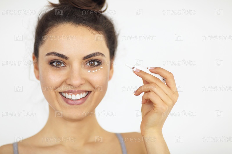 Молодая женщина наносит крем для глаз на идеальную кожу