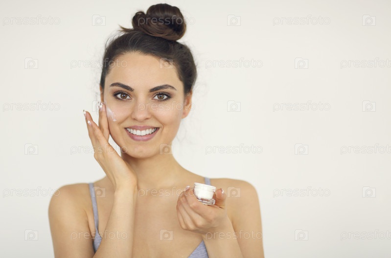 Молодая женщина наносит крем для лица на идеальную кожу