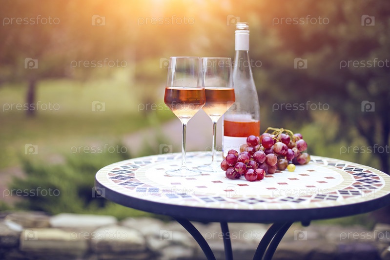 Два стакана и бутылка розового вина в осеннем винограднике на мраморном столе