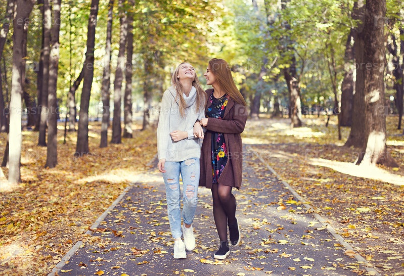Модные красивые молодые подруги гуляют вместе на фоне осеннего парка. Веселимся и позируем